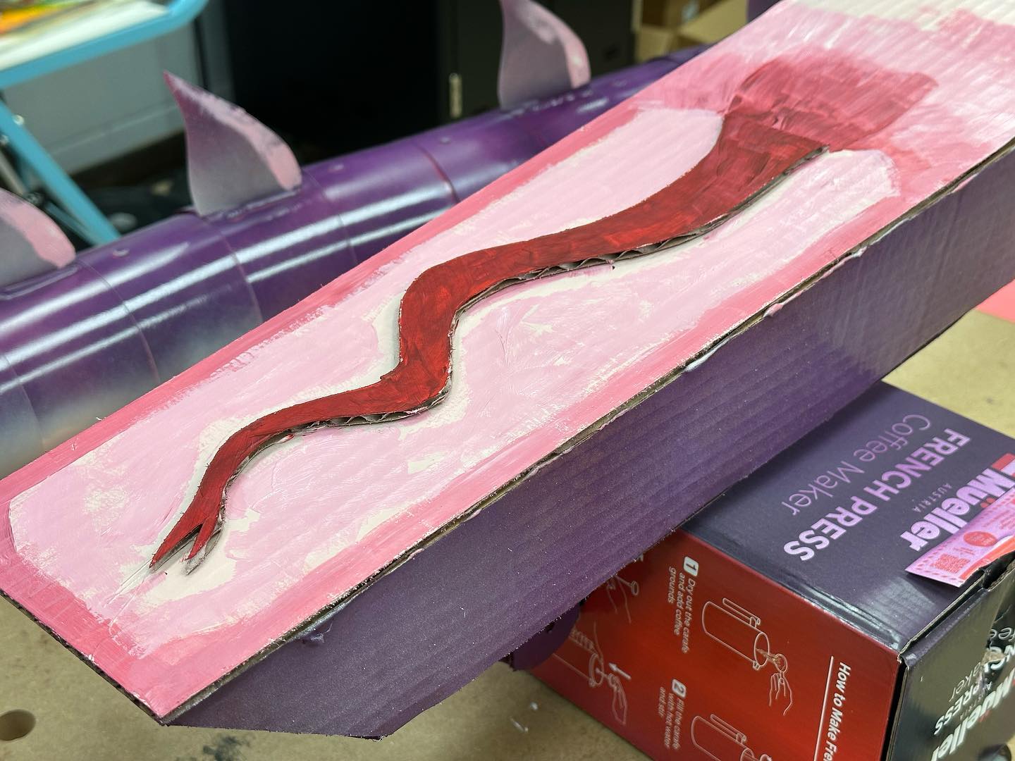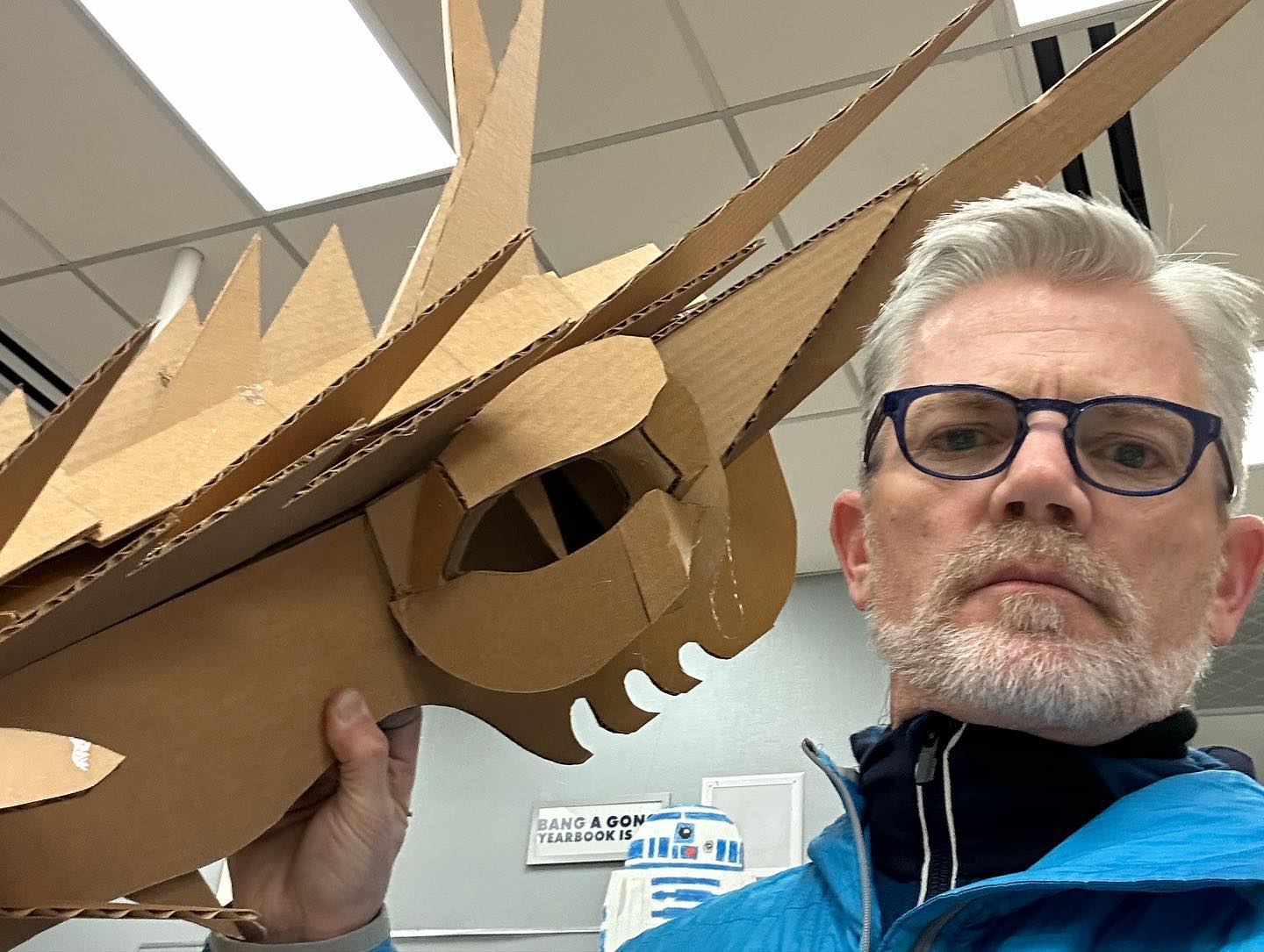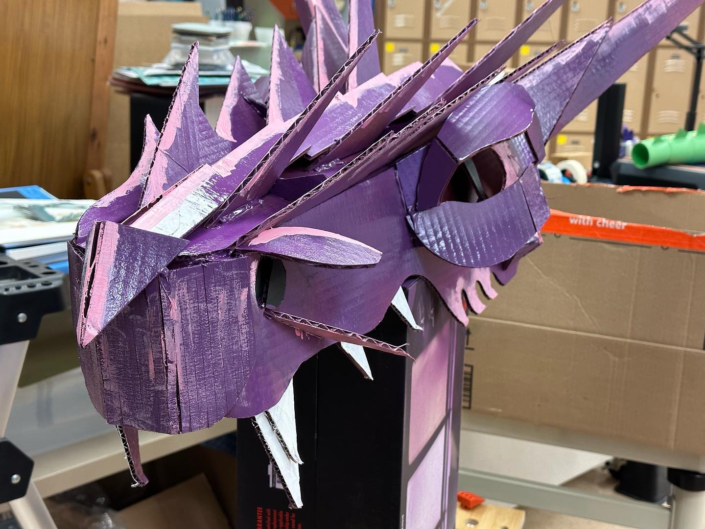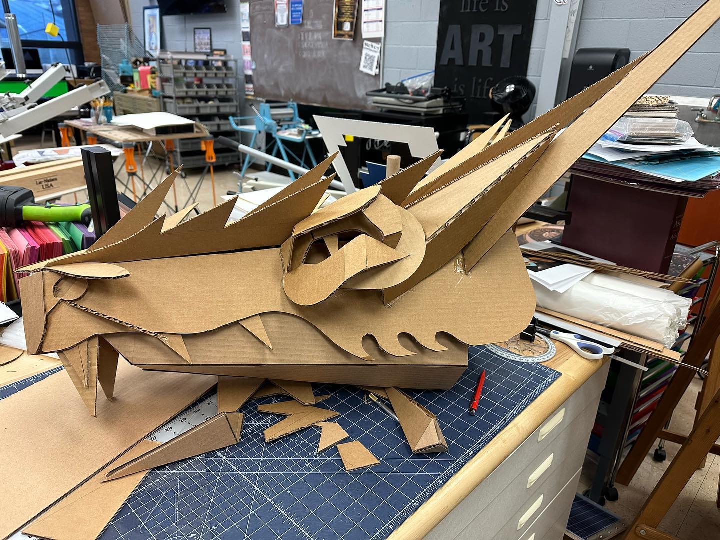 With one thing and another, I’ve been building a dragon over the past month – corrugated cardboard, poster board, hot glue, brass brads, and spray and acrylic paints. It’s been a fantastic build. I’ll need to integrate it into my classroom ceiling in the near future.